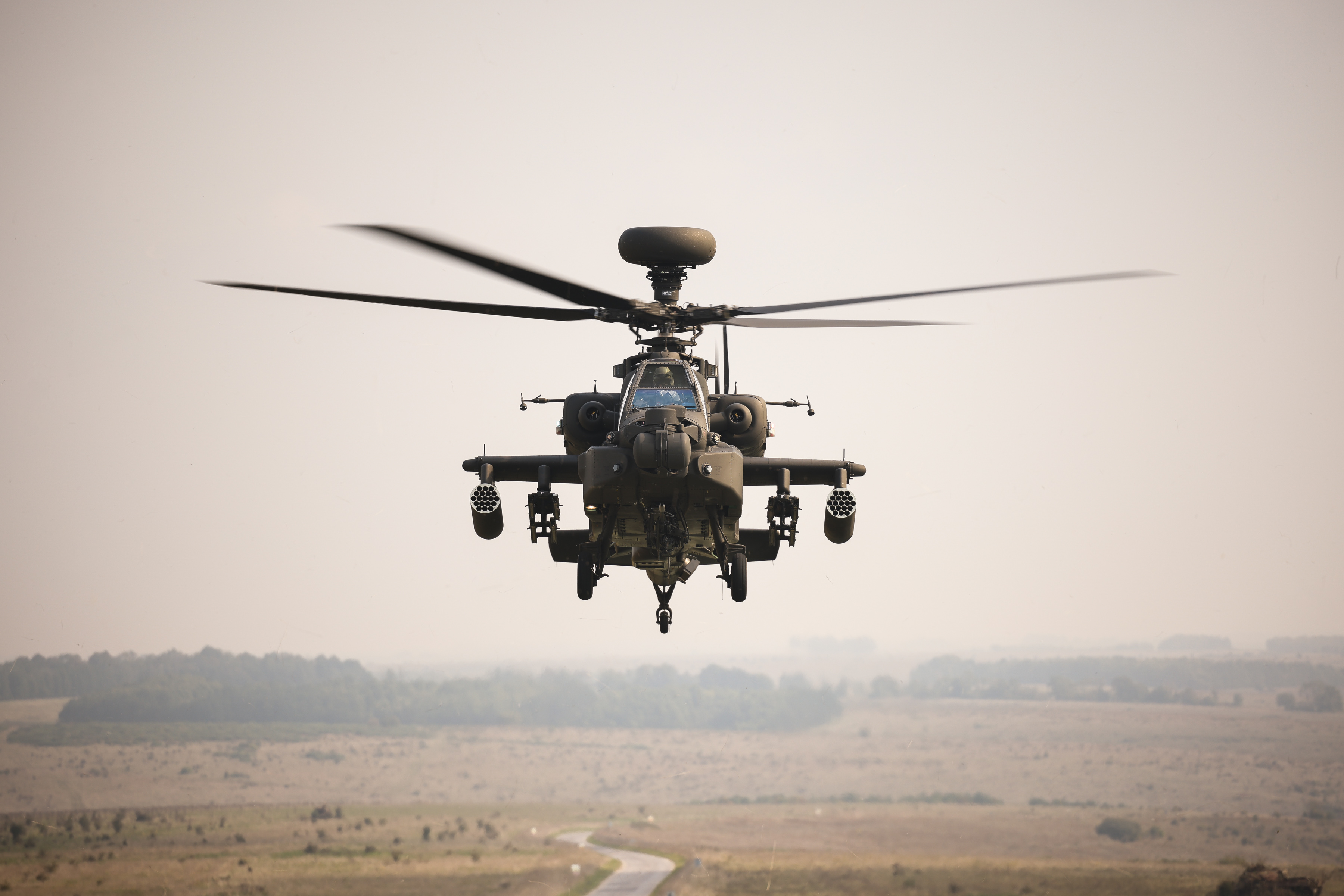 Above: A Boeing AH-64E Apache Attack Helicopter flies over Salisbury Plain Training Area during a live demonstration on 19th September 2024.