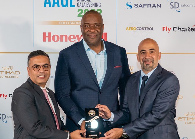 (left to right) Inmarsat’s Rahul Behal and Ijaz Khan collect the ‘New Technology Innovation’ award from Kenneth Mitchen, Executive Director at Creative Middle East Media, organiser of the Aviation Innovation Awards.