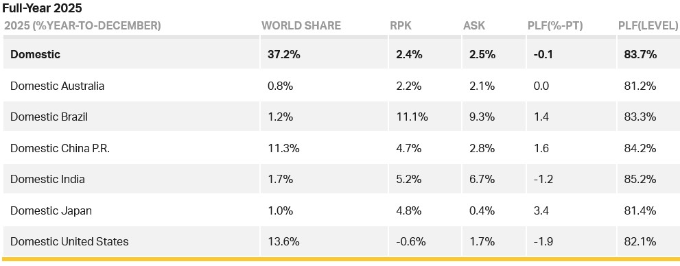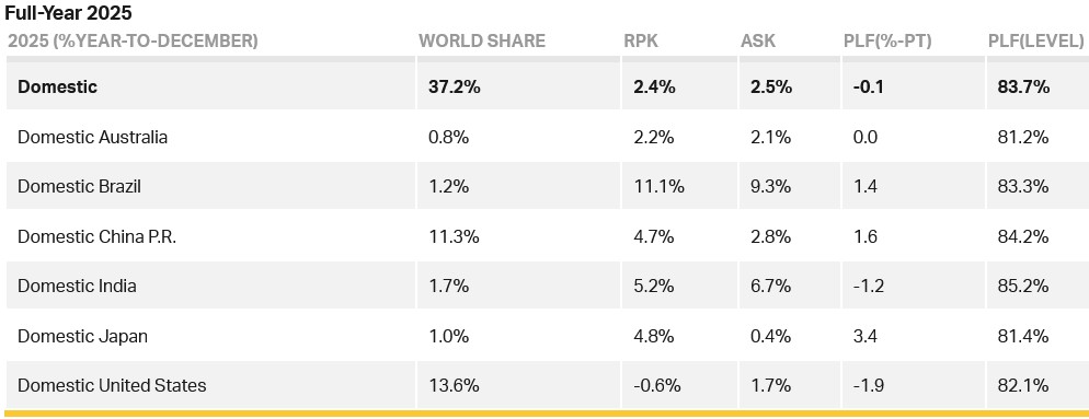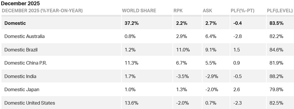 Domestic full-year demand reached record highs for passenger numbers and load factors. Growth slowed compared to the strong rebound in 2024. The standout performer for 2025 Domestic RPK was Brazil, which increased 11.1% over 2024. The United States saw its domestic market contract by -0.6%. The sharpest increase in load factor was in Japan (+3.4 ppt), in contrast to the United States, which registered the heaviest fall (-1.9 ppt). Although domestic Indian travel also had a sharp (-1.2 ppt) fall in load factor, it still registered the highest load factor overall (85.2%). Australia had the lowest load factor but this was still a relatively healthy 81.2%.