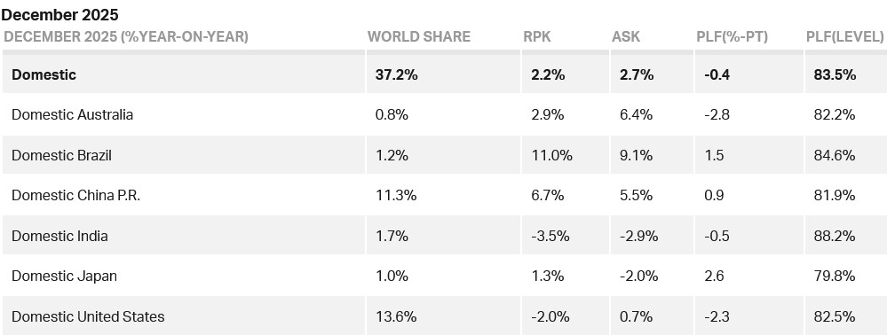 Full-year international traffic rose by 7.1% compared to 2024, while capacity rose 6.8%. For the month of December, international demand grew by 7.7%, capacity increased 7.9%, and the load factor declined by 0.1 ppt (compared to December 2024) to 83.9%.