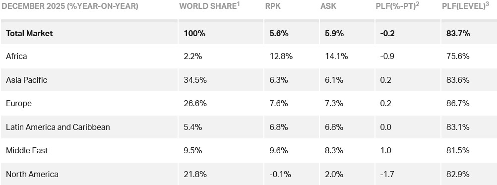 Asia-Pacific airlines posted a 10.9% rise in full year international 2025 traffic compared to 2024. Capacity rose 10.2% and the load factor rose 0.5 ppt to 84.4%. The region finished 2025 with the fastest growth rate and highest load factor of any region. December 2025 traffic rose 7.5% compared to December 2024.