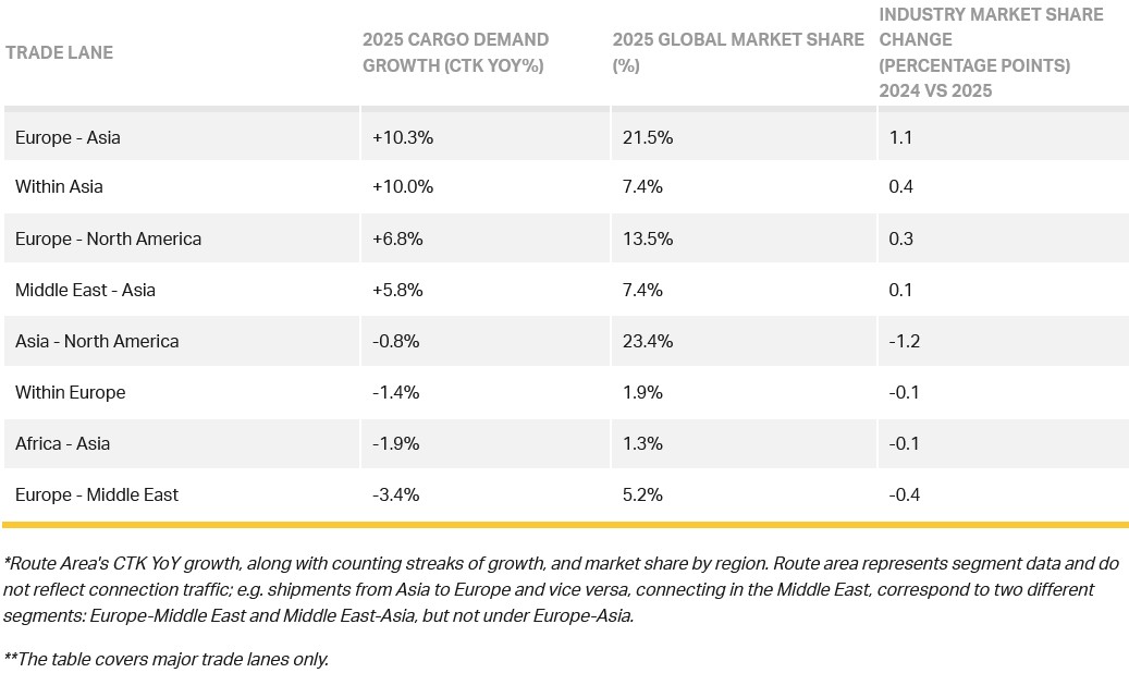 Twenty twenty-five trade lane data shows a clear shift in global air cargo flows from Asia–North America to Asia–Europe, driven by tariff pressures and the removal of the US de minimis exemption. The Within Asia, and the Middle East–Asia corridor also recorded strong growth.