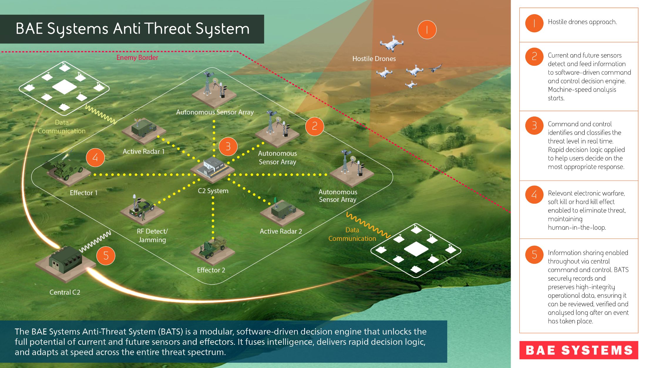 The BAE Systems Anti Threat System or ‘BATS’ will enable customers to reduce the use of costly missiles by instead deploying smart software, electronic warfare and kinetic measures to tackle increasing drone incursion threats to national borders, military equipment, airports and urban centres.
